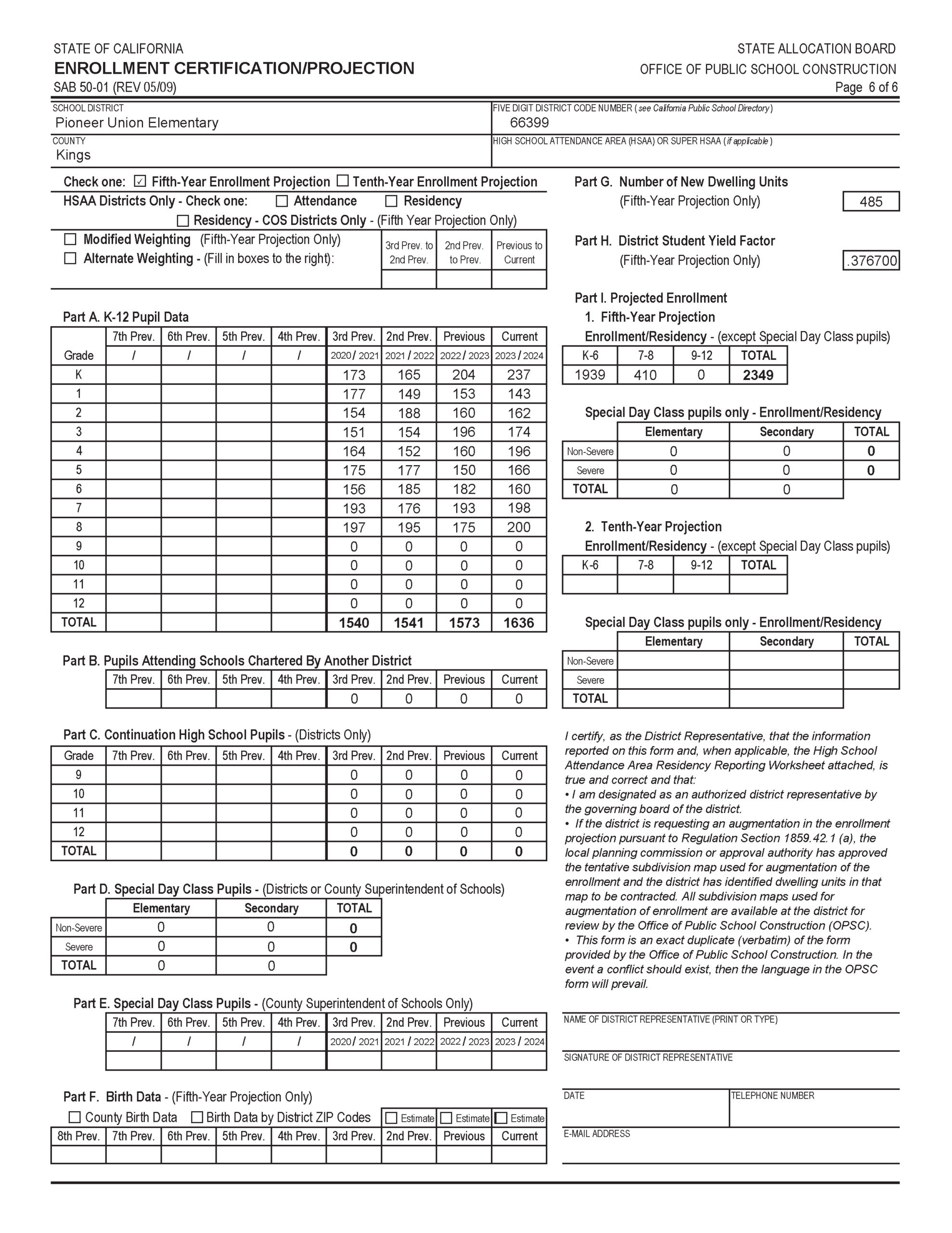 The Pioneer Union Elementary School District has experienced an average new residential construction rate of approximately 241 units per year over the past four years. This was determined by reviewing the residential permits pulled and school development impact fees paid to the District. After contacting the city planning department within the school district boundaries, it was determined that the residential construction rate over the next five years will average 97 units per year. Projecting the average rate forward, we would expect that 485 units of residential housing will be built within the District boundaries over the next five years.