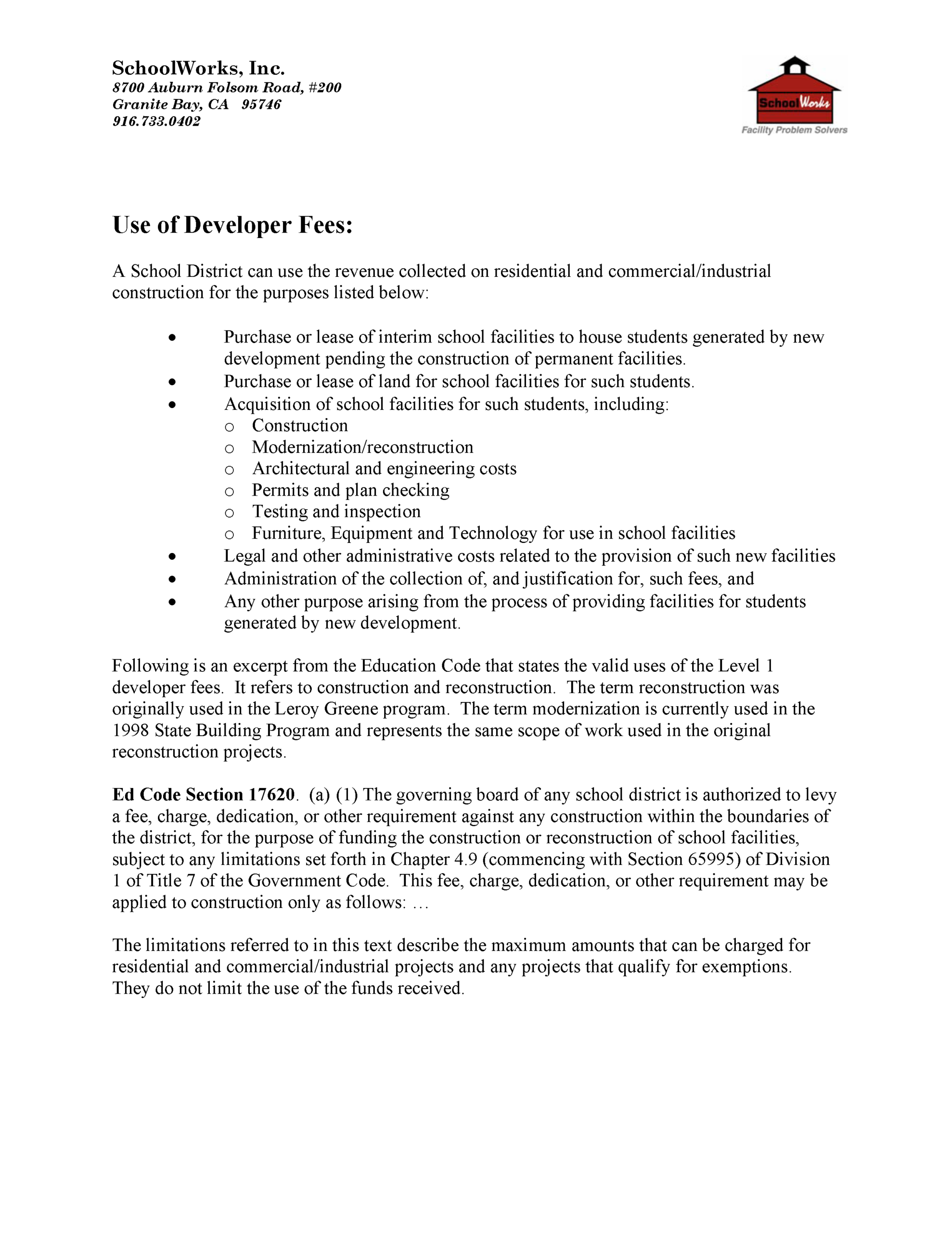 Education Code Section 17620 allows school districts to assess fees on new residential and commercial construction within their respective boundaries. These fees can be collected without special city or county approval, to fund the construction of new school facilities necessitated by the impact of residential and commercial development activity. In addition, these fees can also be used to fund the reconstruction of school facilities to accommodate students generated from new development projects. Fees are collected immediately prior to the time of the issuance of a building permit by the City or the County.