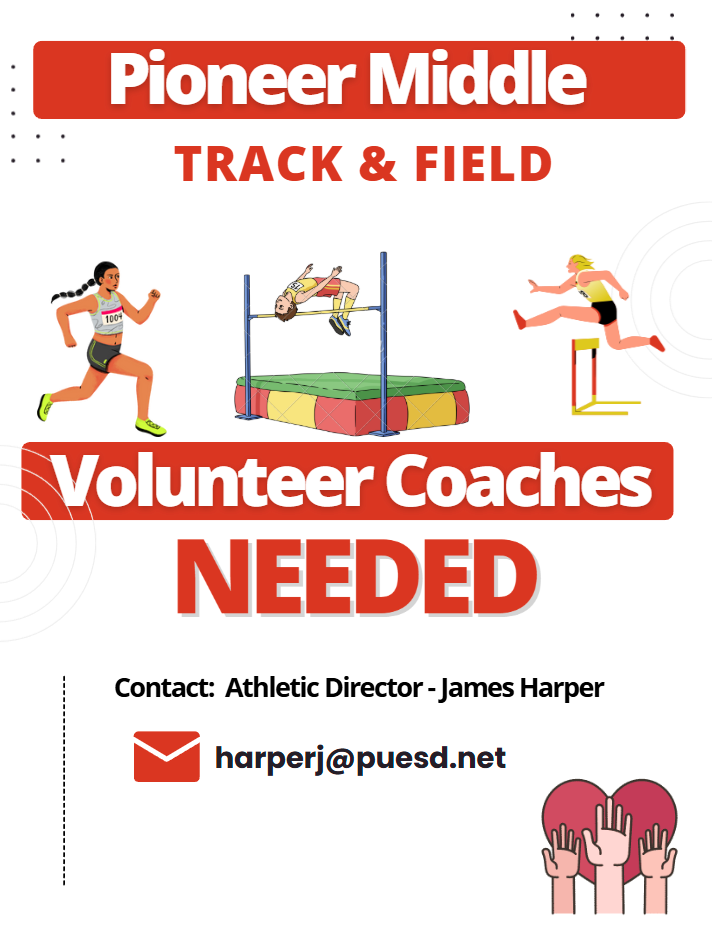 Track & Field Volunteer Coaches Needed Pioneer Middle School is looking for Track and Field Volunteer Coaches for the upcoming season. If you are interested please contact our Athletic Director, Mr. Harper @ [email protected] andersonj2026-01-20T13:15:14-08:00 Related Posts Happy Counselor’s Week Mrs. Freitas! Gallery Happy Counselor’s Week Mrs. Freitas! Weekly Bulletin 2/1 – 2/7 Gallery Weekly Bulletin 2/1 – 2/7 Weekly Bulletin 1/25 – 1/31 Gallery Weekly Bulletin 1/25 – 1/31 Pioneer Middle PTC Fundraiser – Nothing Bundt Cakes! Gallery Pioneer Middle PTC Fundraiser – Nothing Bundt Cakes!