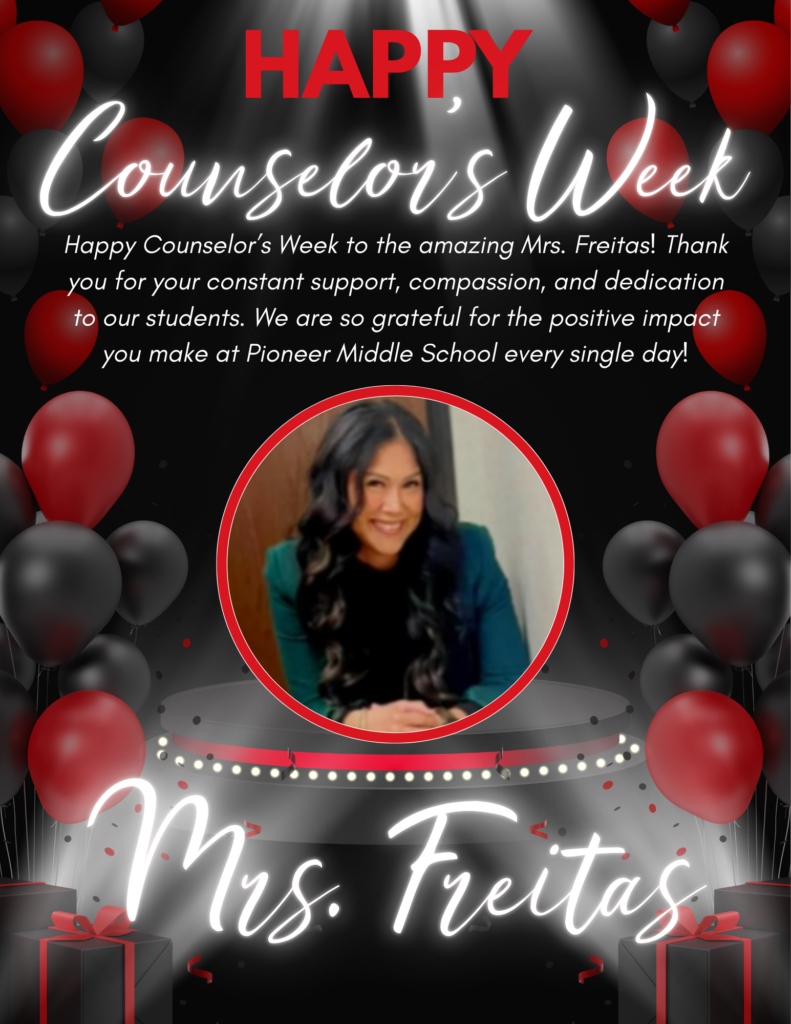 Happy Counselor’s Week to the amazing Mrs. Freitas! Thank you for your constant support, compassion, and dedication to our students. We are so grateful for the positive impact you make at Pioneer Middle School every single day!
