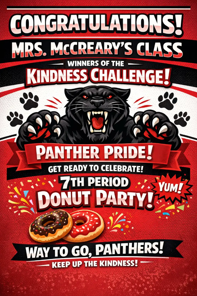 Kindness Week Challenge Winners! Congratulations to Mrs. McCreary’s 7th Period Class, they are the Winners of the Kindness Challenge!!! Get Ready to Celebrate with a Donut Party!!! Way to go Panthers, Keep up the Kindness!!! andersonj2026-02-03T15:36:55-08:00 Related Posts Counselor Connect Meeting #5 – Tomorrow Gallery Counselor Connect Meeting #5 – Tomorrow Yearbook: Only 10 day left for 8th Grade Recognition / Baby Ads Gallery Yearbook: Only 10 day left for 8th Grade Recognition / Baby Ads Happy Counselor’s Week Mrs. Freitas! Gallery Happy Counselor’s Week Mrs. Freitas! Weekly Bulletin 2/1 – 2/7 Gallery Weekly Bulletin 2/1 – 2/7