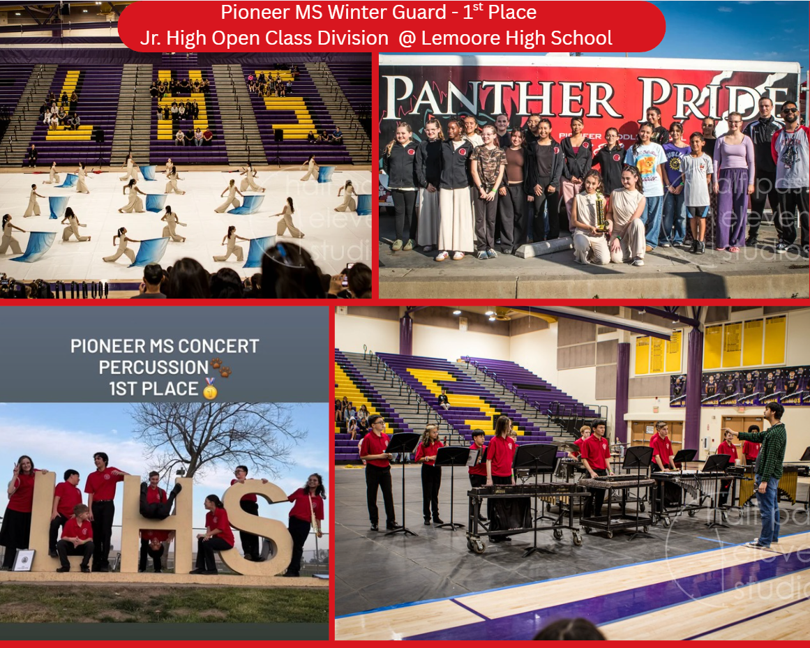 This weekend, the Pioneer Winter Guard and Pioneer Percussion Ensemble took the floor at Lemoore High School for their first competition of the seasonโand delivered incredible performances. The Pioneer Winter Guard, two-time Jr. High School Scholastic A Champions, earned their FIRST-EVER 1st Place trophy in the Jr. High School Open Class division, marking a huge milestone for the program.